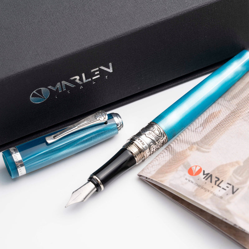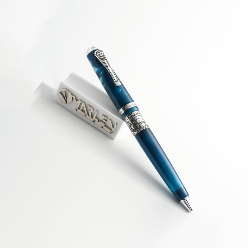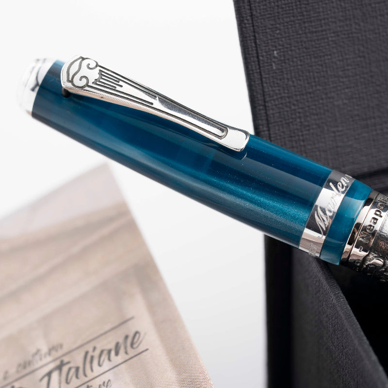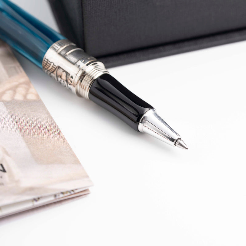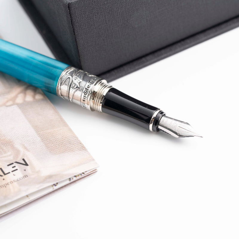 Corps et capuchon en résine italienne usinée dans un bloc massif, avec des pièces métalliques en argent, bronze et métal. Plume en acier plaqué or. Système de remplissage par cartouche ou convertisseur. Le stylo Ippocrate est disponible en cinq couleurs : bordeaux, bleu foncé, noir, rouge et blanc.