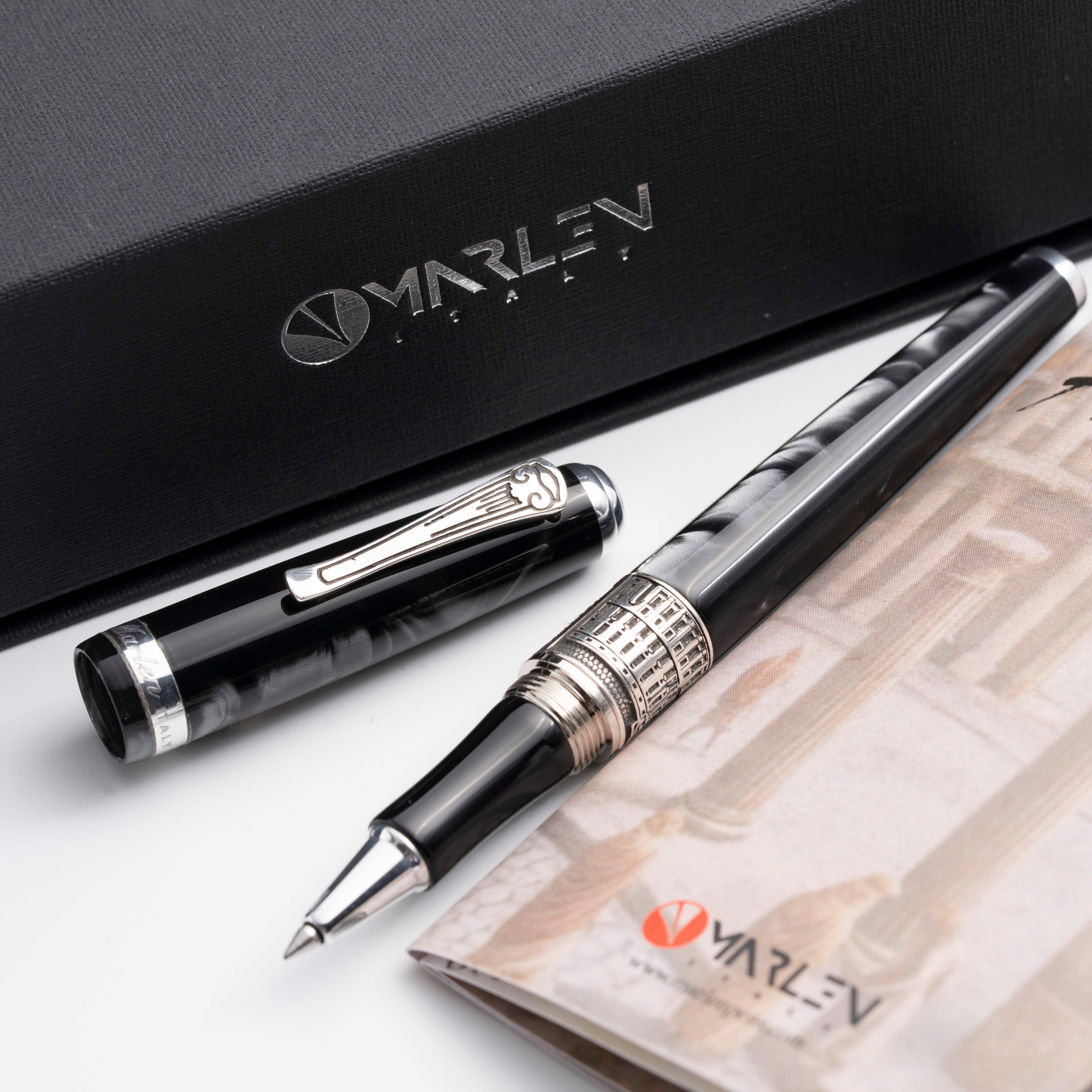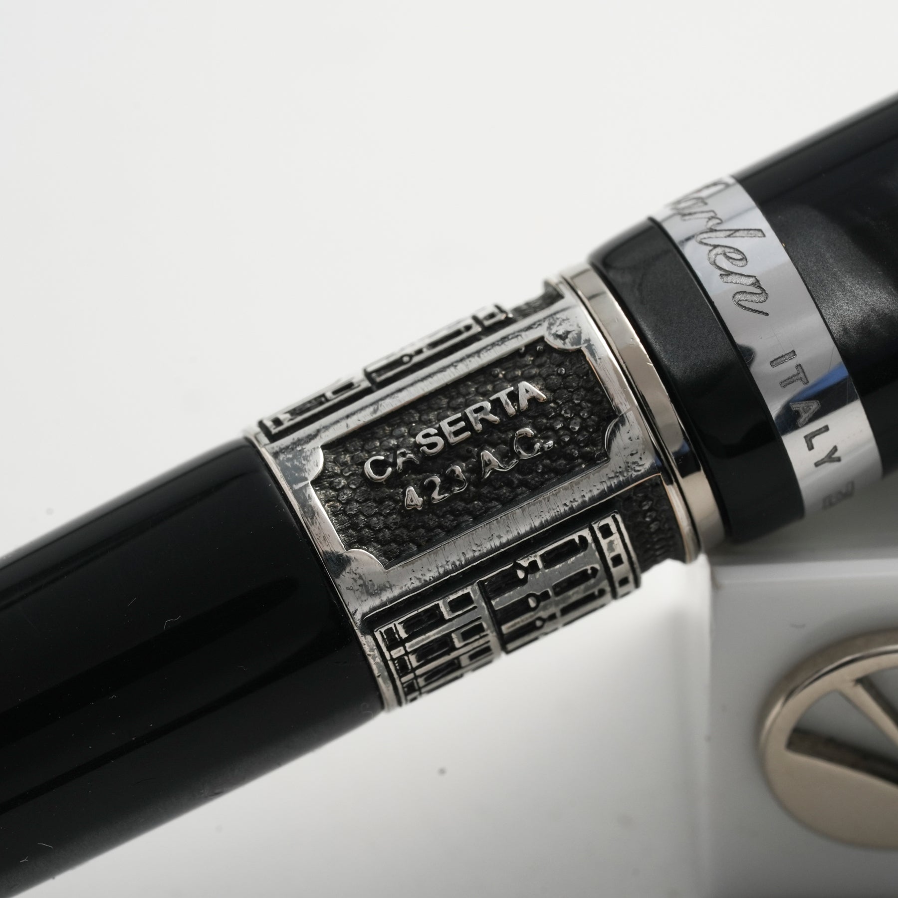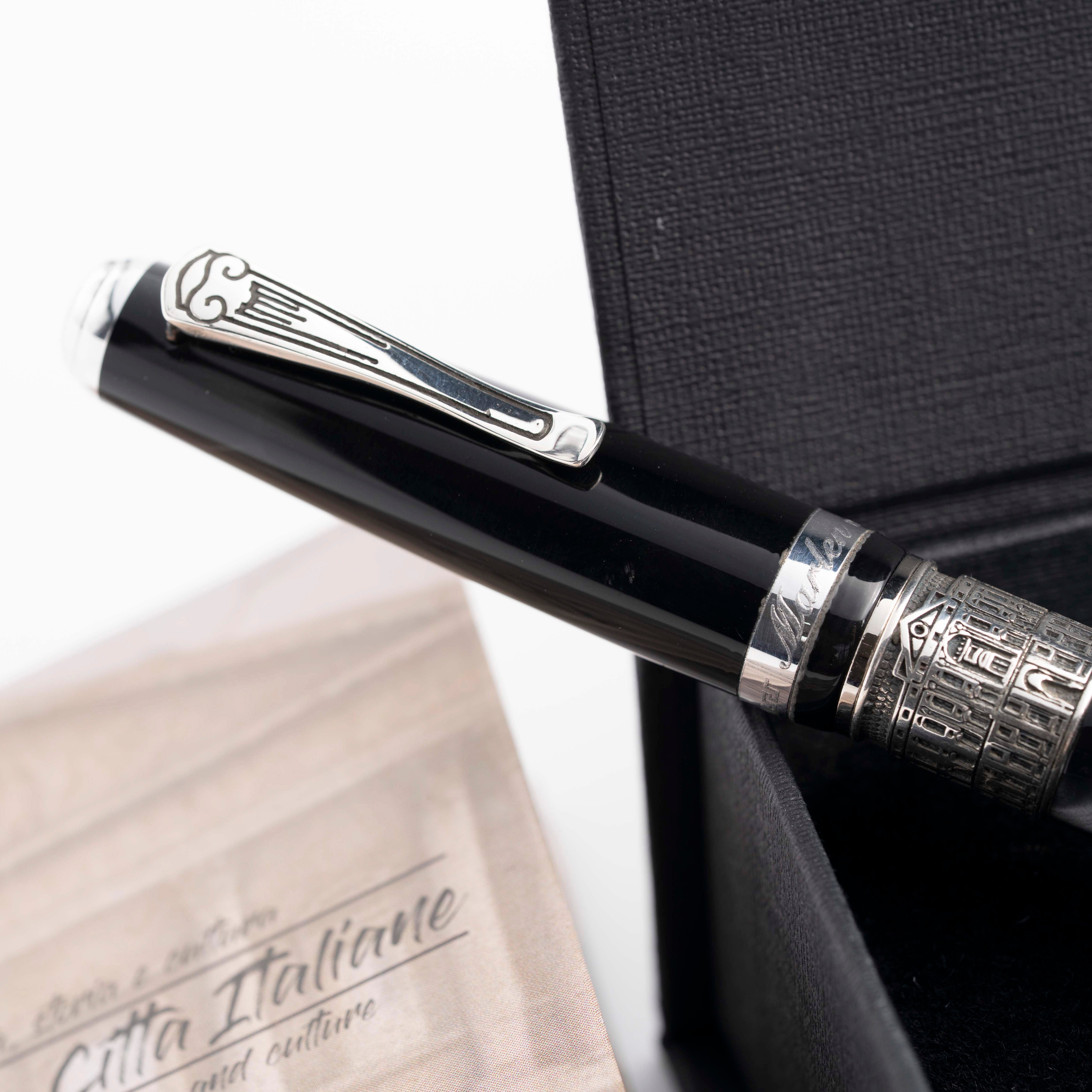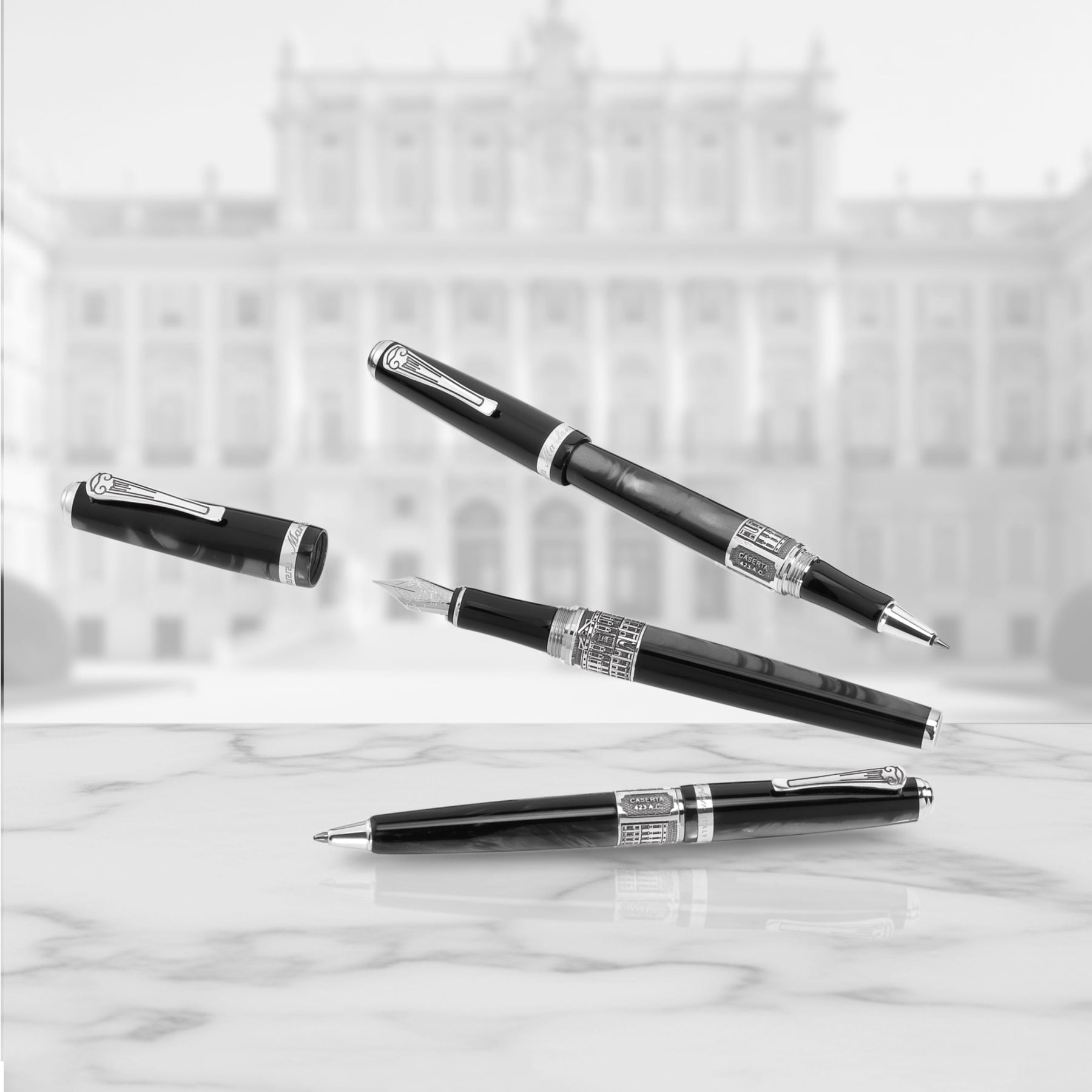 Realizzata in resina italiana grigia scura sfumata, questa collezione cattura l’essenza maestosa della città. La clip della penna replica la forma di una colonna, simbolo di grandezza e architettura classica. L’anello sul corpo della penna presenta una veduta della Reggia di Caserta, insieme alla data presunta di fondazione della città, che ne celebra la storia e l’importanza storica. Ogni dettaglio è studiato per evocare la bellezza e la magnificenza della Reggia, rendendo questa penna un oggetto di culto per gli amanti della storia e dell’arte.
