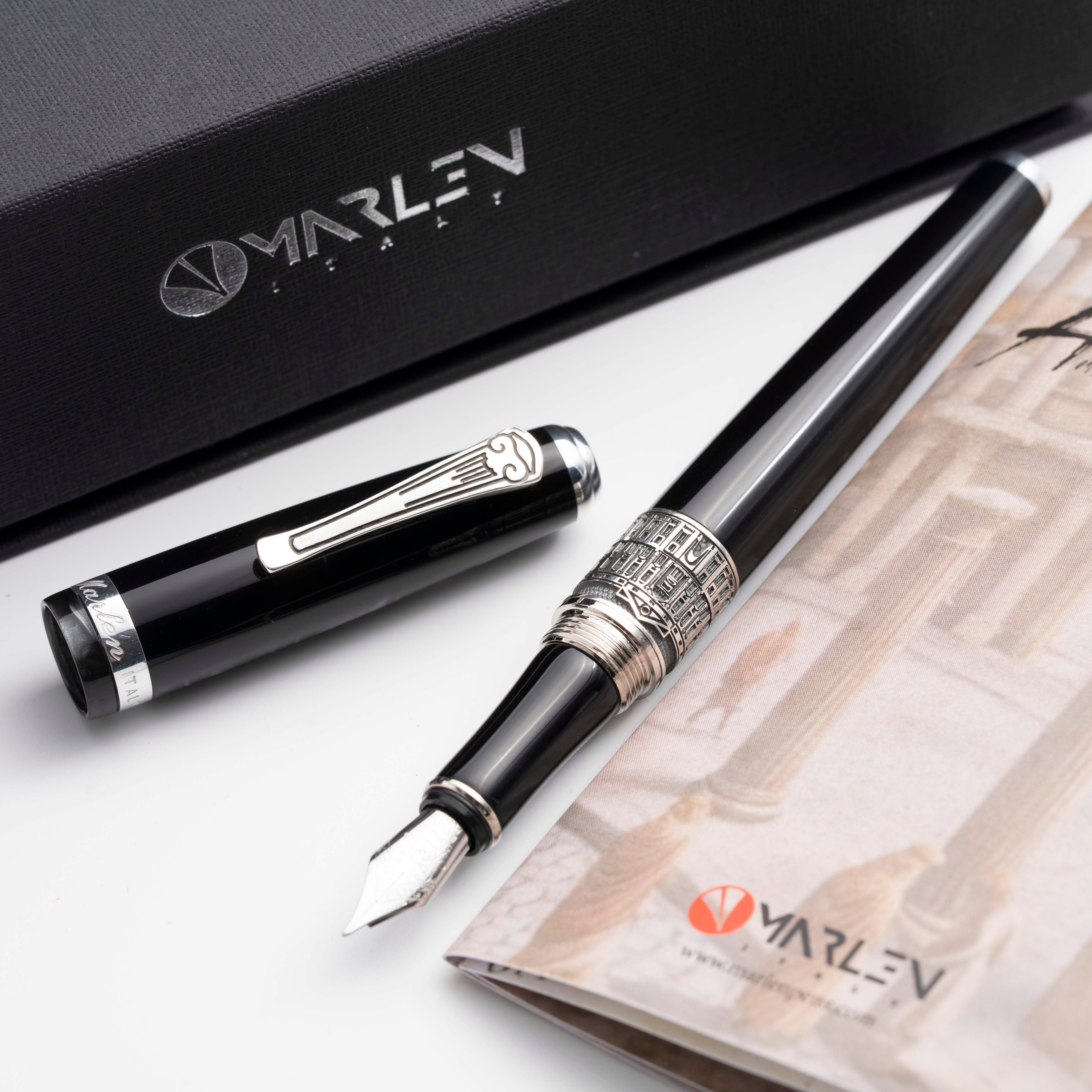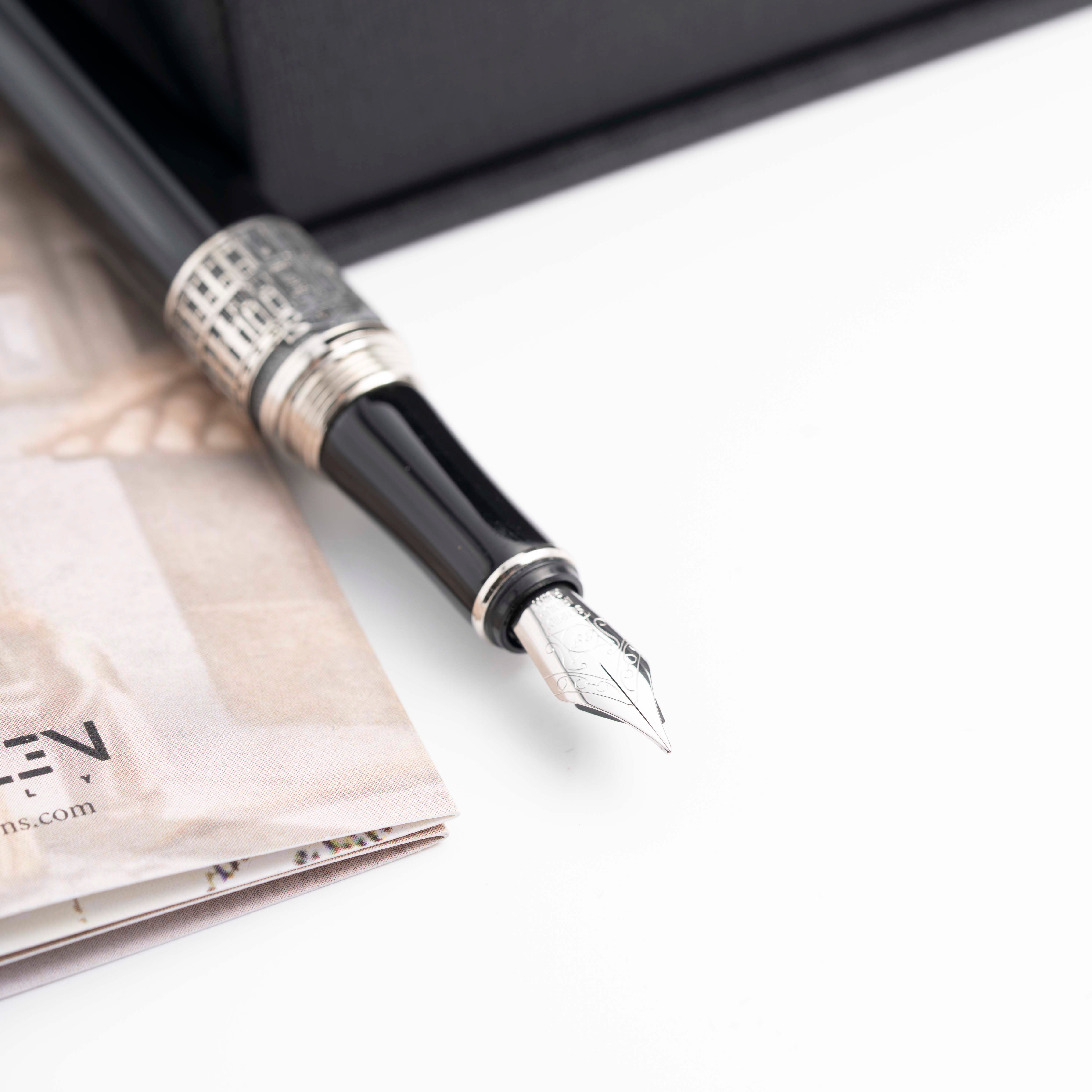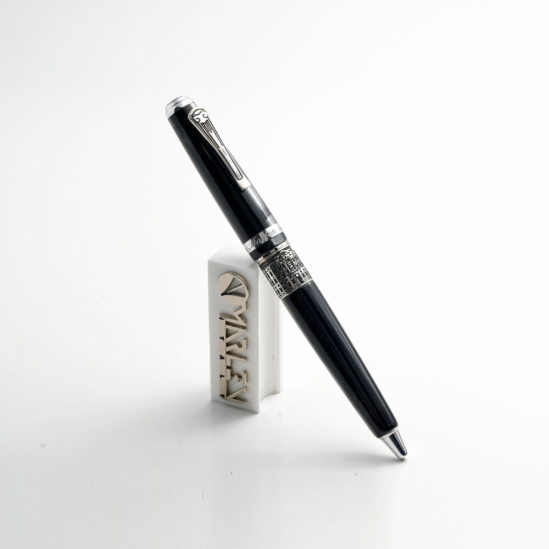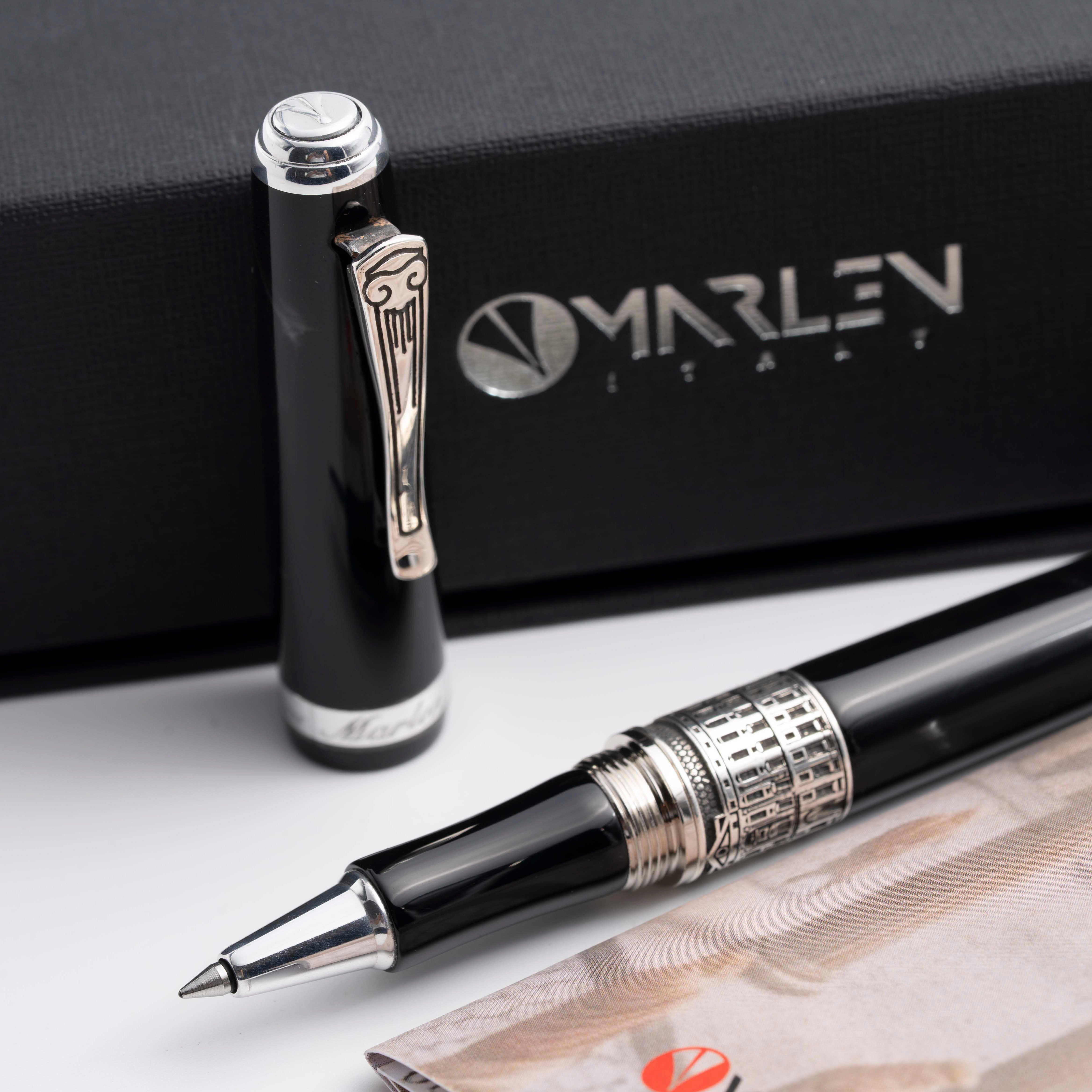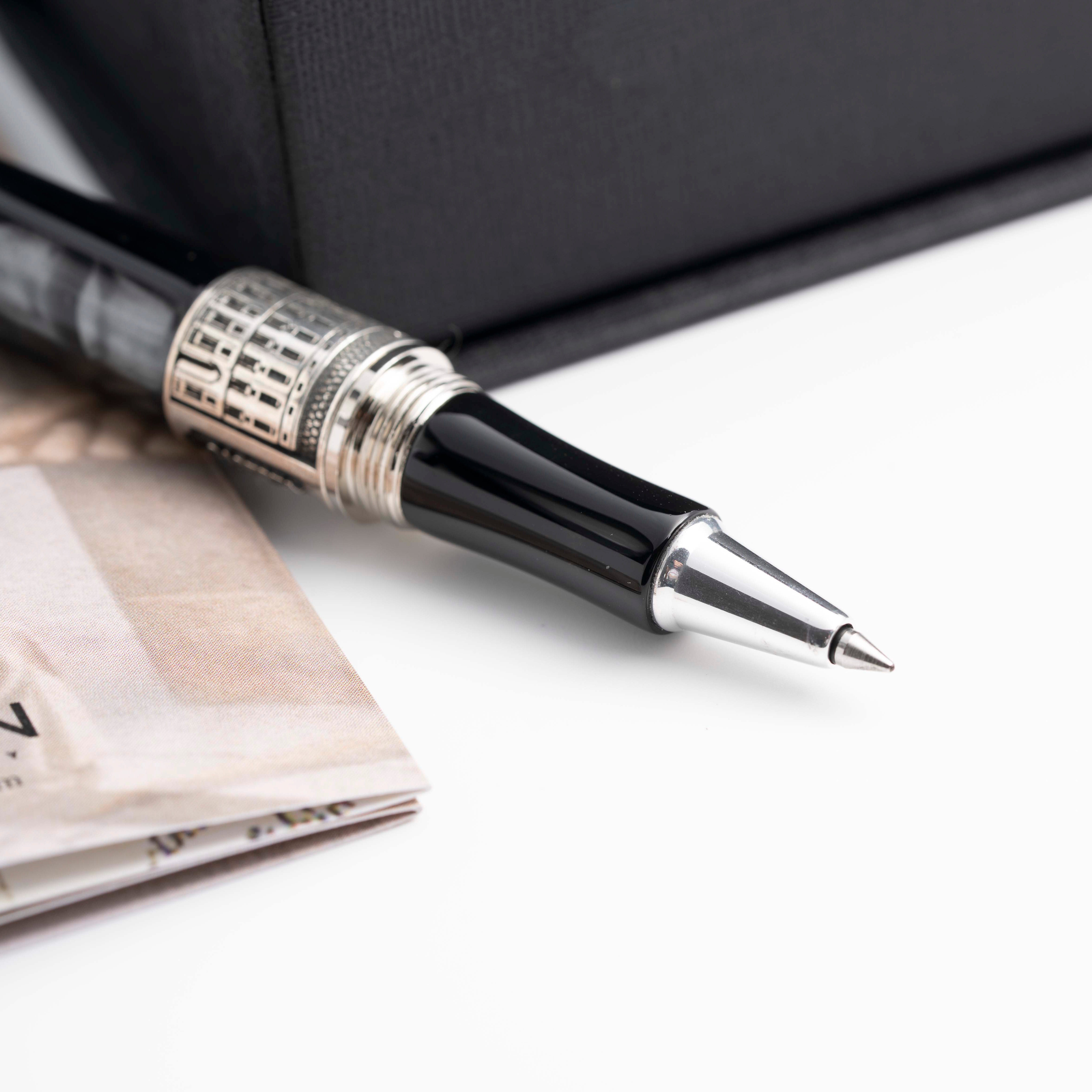 Realizzata in resina italiana grigia scura sfumata, questa collezione cattura l’essenza maestosa della città. La clip della penna replica la forma di una colonna, simbolo di grandezza e architettura classica. L’anello sul corpo della penna presenta una veduta della Reggia di Caserta, insieme alla data presunta di fondazione della città, che ne celebra la storia e l’importanza storica. Ogni dettaglio è studiato per evocare la bellezza e la magnificenza della Reggia, rendendo questa penna un oggetto di culto per gli amanti della storia e dell’arte.