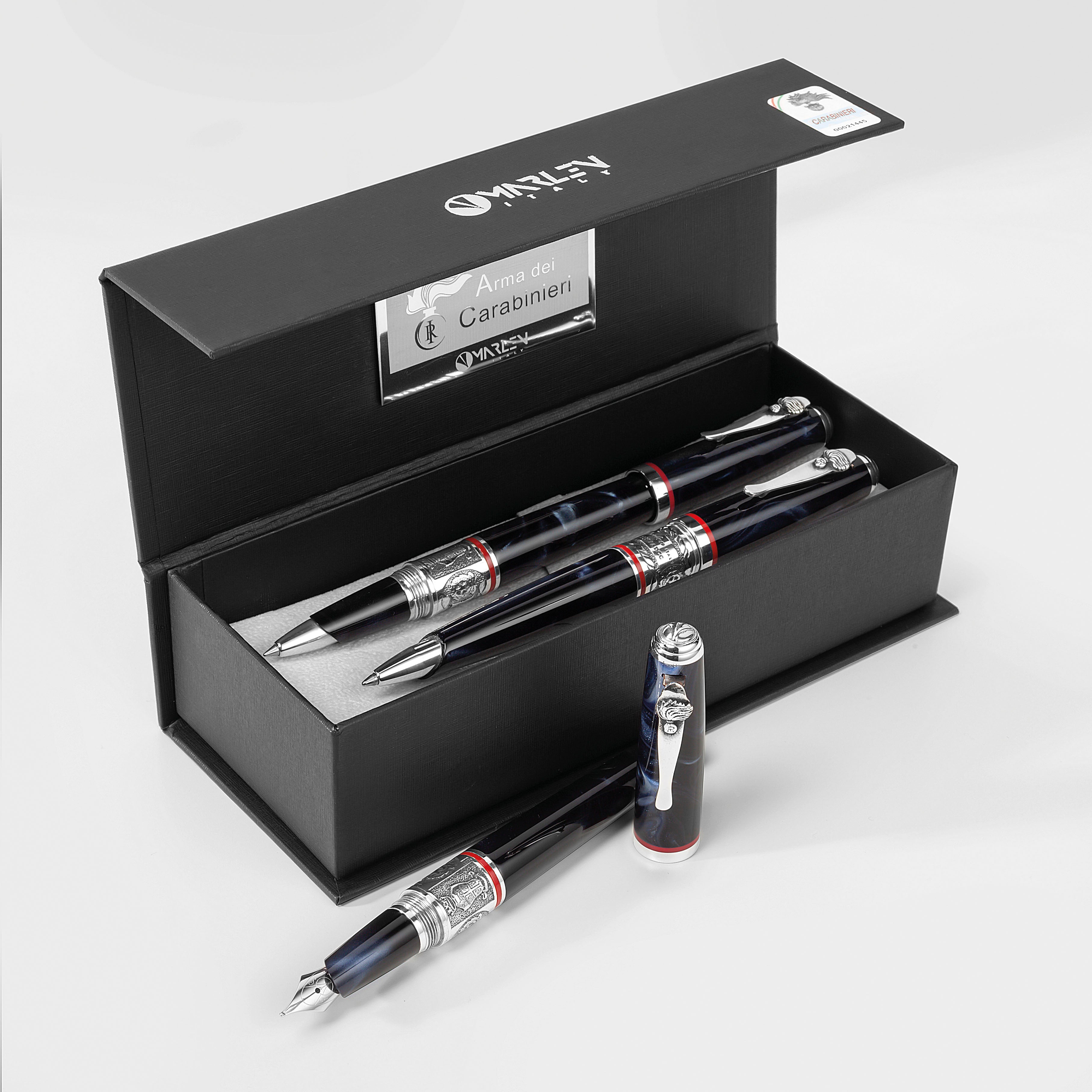Anche l’Arma dei Carabinieri sceglie Marlen per la creazione di una prestigiosa collezione di strumenti da scrittura. L’Arma di Calliope, rappresenta la sintesi perfetta dell’immagine dell’Arma dei Carabinieri. La qualità manifatturiera dei prodotti Marlen si fonde con i colori e gli stemmi della Benemerita dando vita ad una collezione esclusiva perfetta per rappresentare un’istituzione così importante. Fusto e cappuccio realizzati in resina italiana tornita da barra piena. Sulla clip in argento è riprodotto il simbolo della Fiamma in due