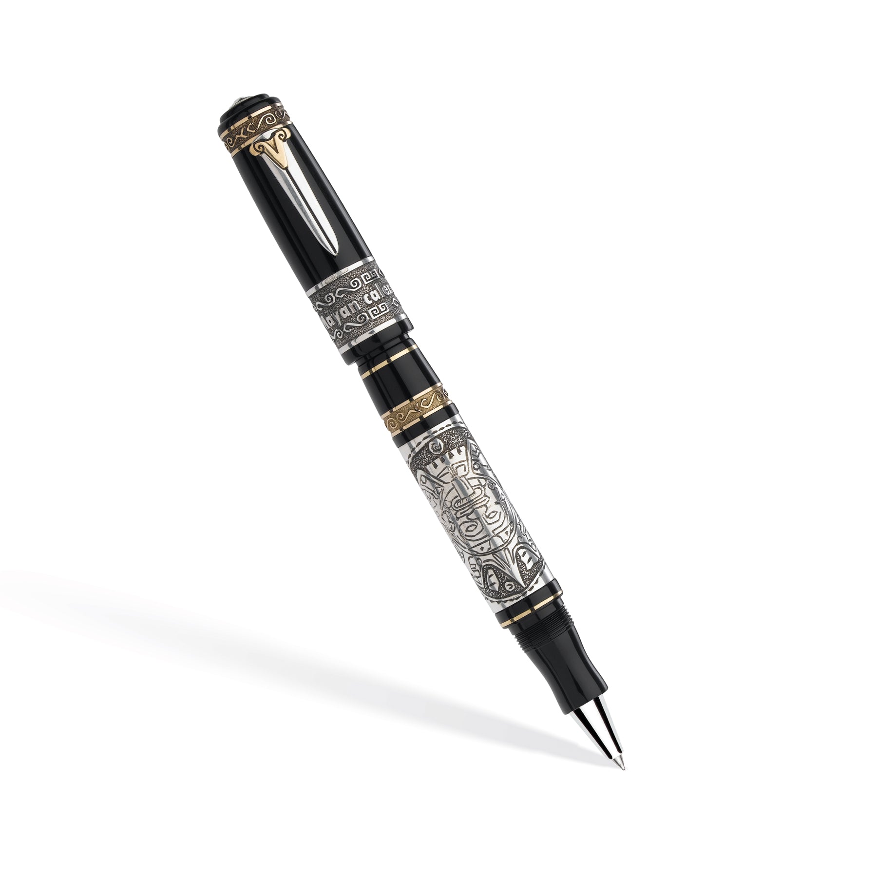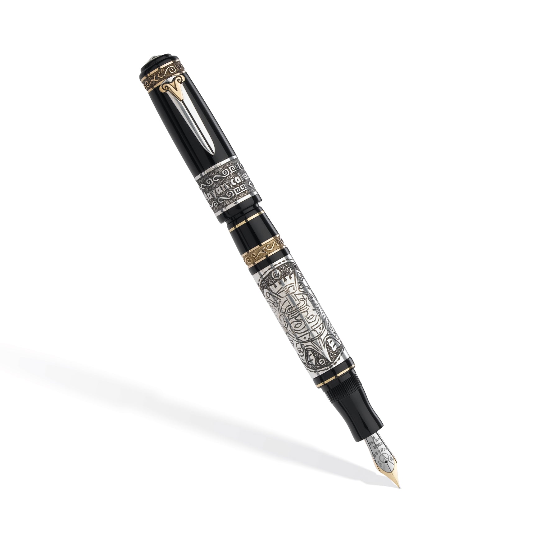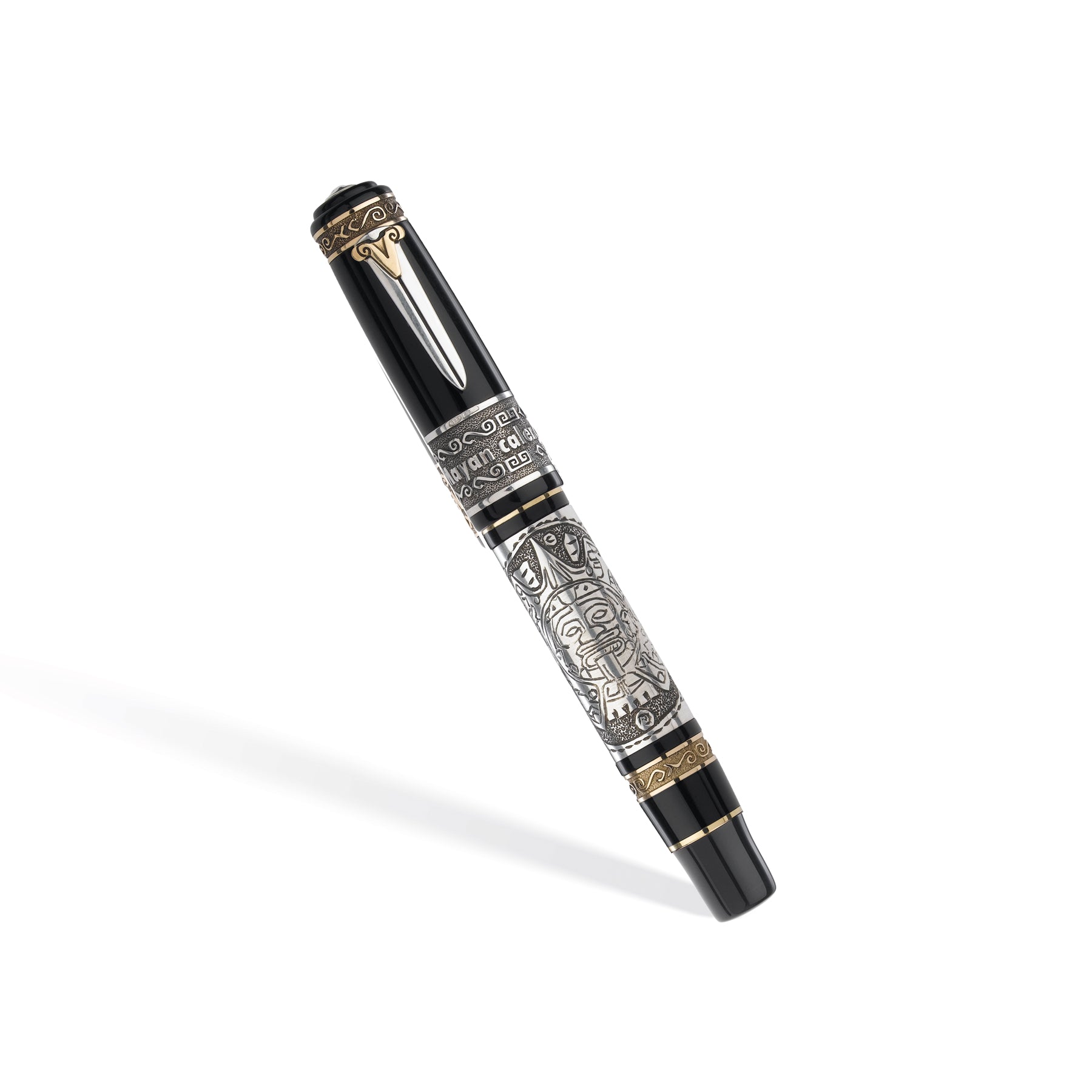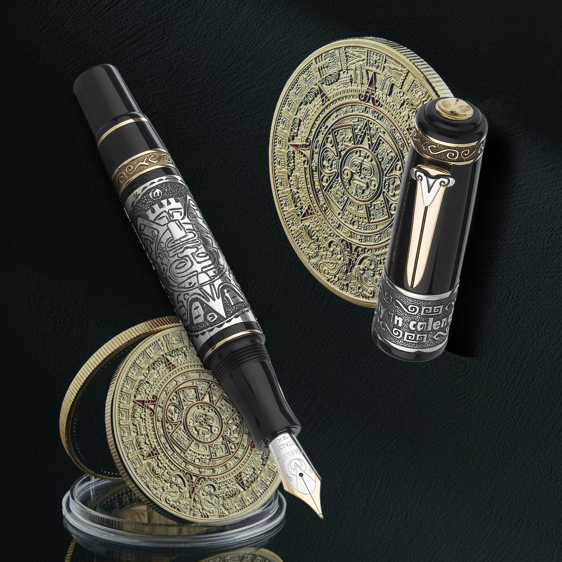 Questa collezione è dedicata al grande popolo dei Maya. C’è tutto un carico di mistero e fascino intorno a questa civiltà. I Maya erano una delle poche antiche civiltà che crearono il proprio sistema di scrittura, nonché uno strumento di misurazione del tempo: il calendario maya da cui prende il nome questa serie. La collezione, è stata realizzata in resina italiana nera, tornita da barra piena. La fascia centrale sul fusto (che riporta l’immagine del calendario Maya), l’ anello sul cappuccio (con inciso il nome della collezione) e la clip (su cui è incastonato uno dei simboli Maya, in bronzo) sono in argento.