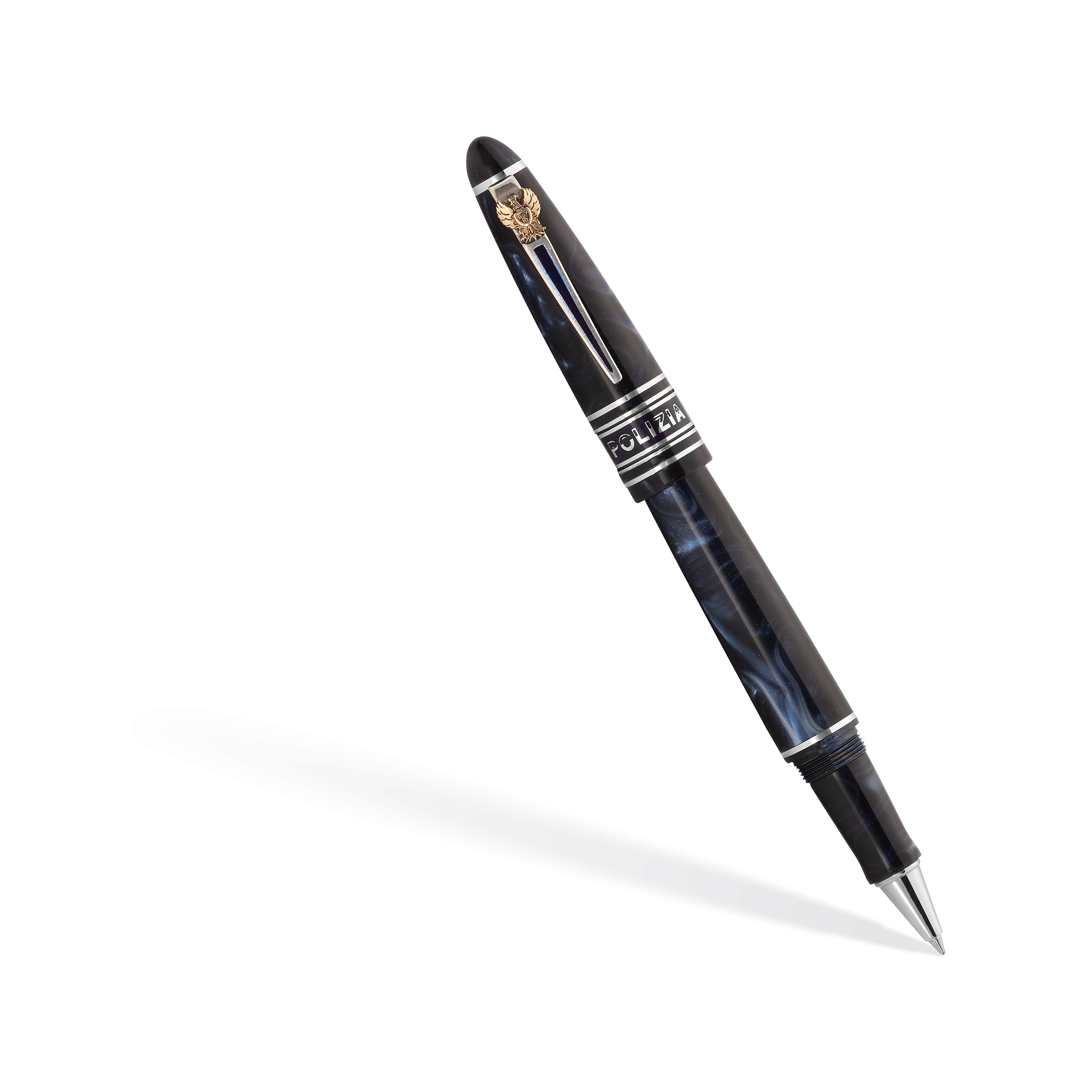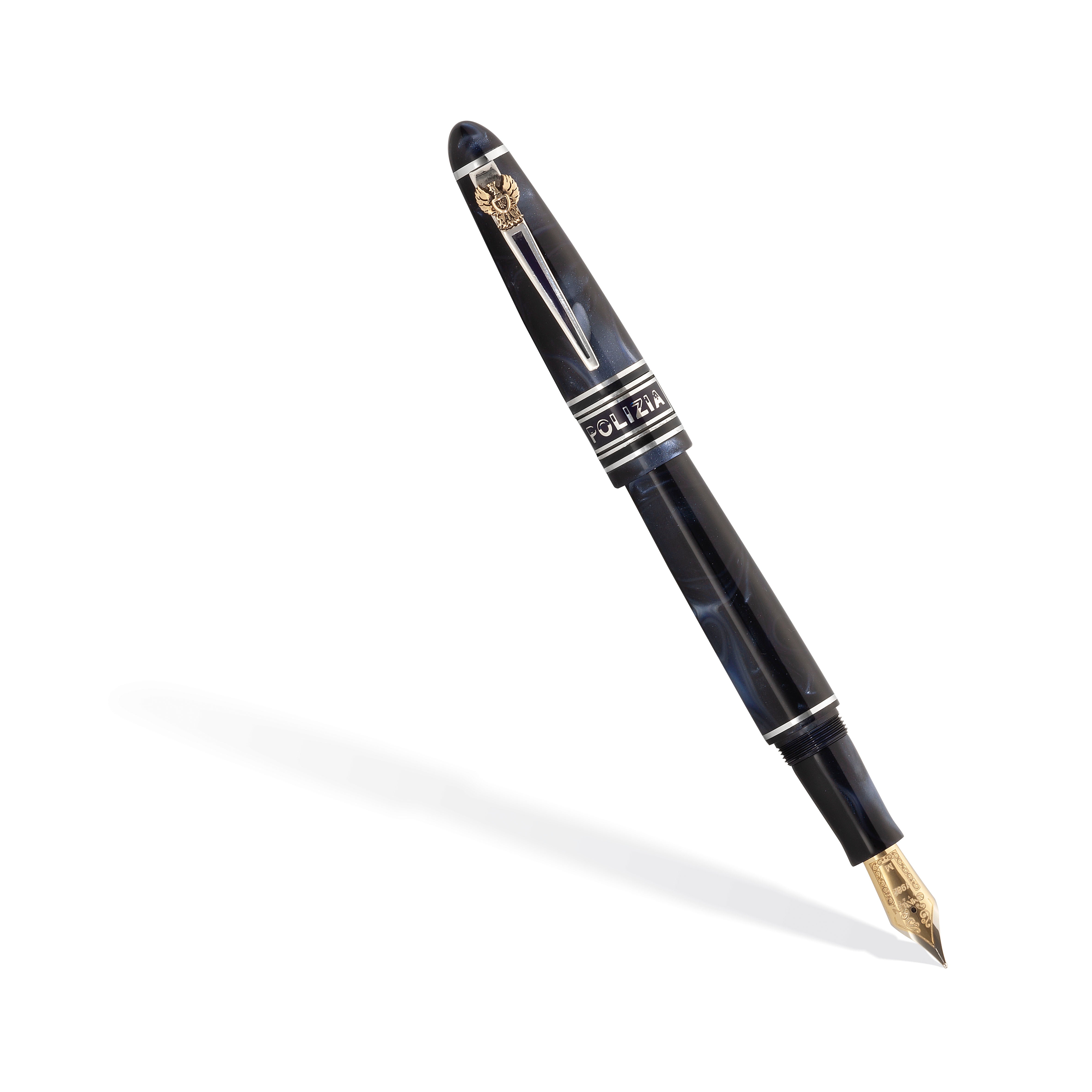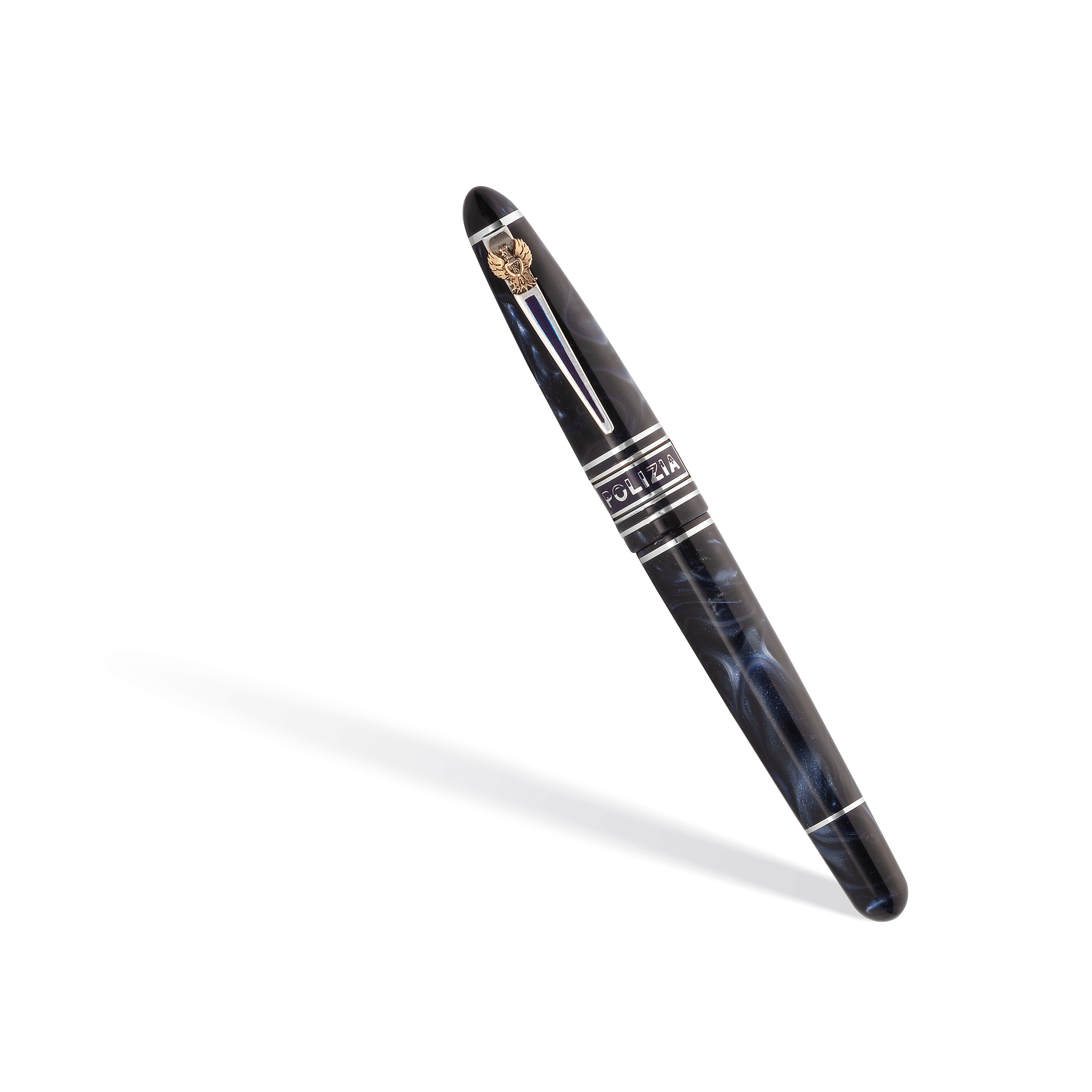Corpo e cappuccio, sono realizzati in resina italiana di colore blu striata. La clip, in argento smaltata in blu, è impreziosita dall’aquila (in bronzo), simbolo di primato e di regalità, da sempre legata al patrimonio araldico della Polizia di Stato.