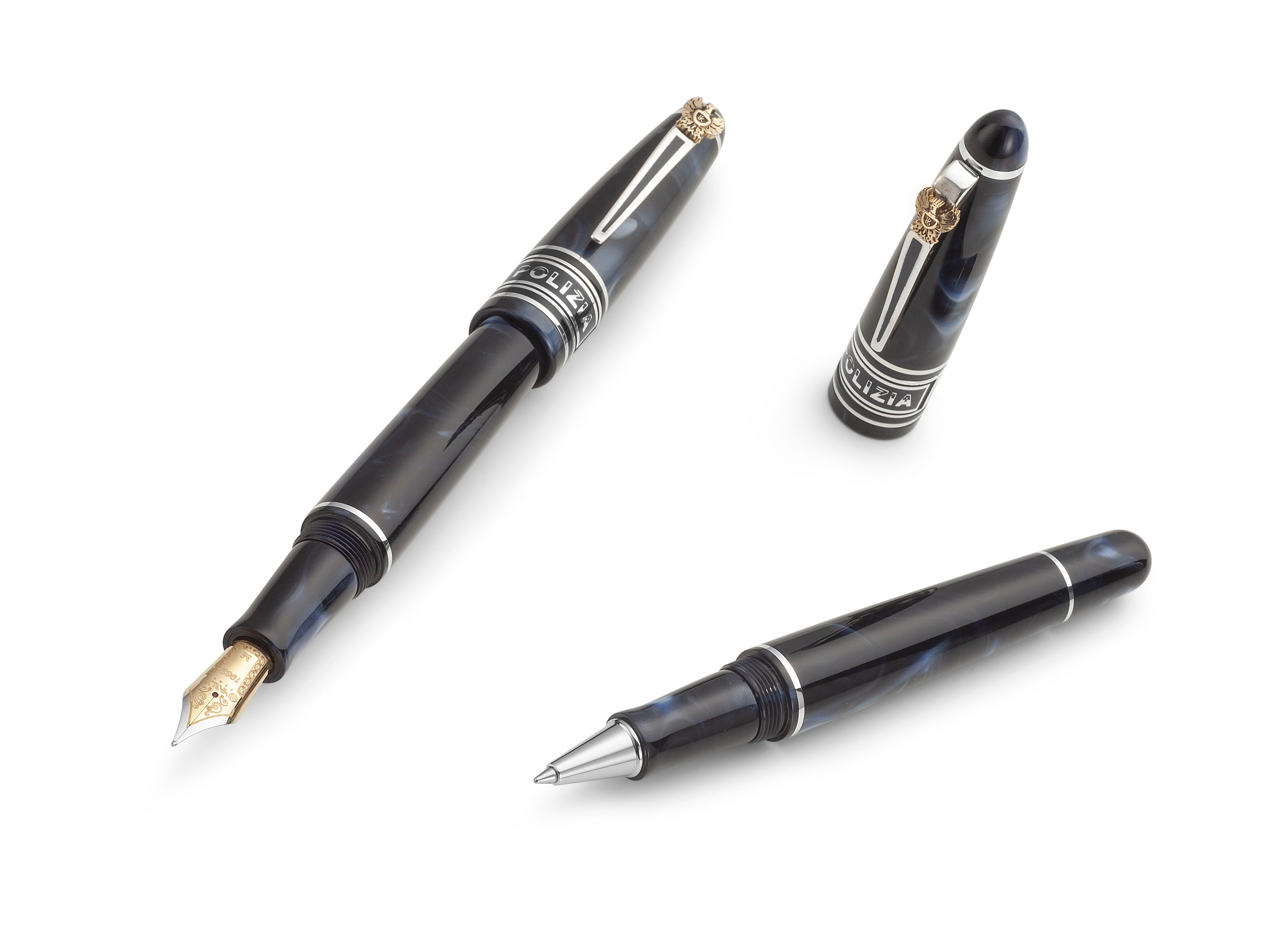 La scritta Polizia in alto basso rilievo con contorni smaltati a mano in blu, caratterizza invece, il grande anello in argento posto sul cappuccio della penna. Altri dettagli in metallo